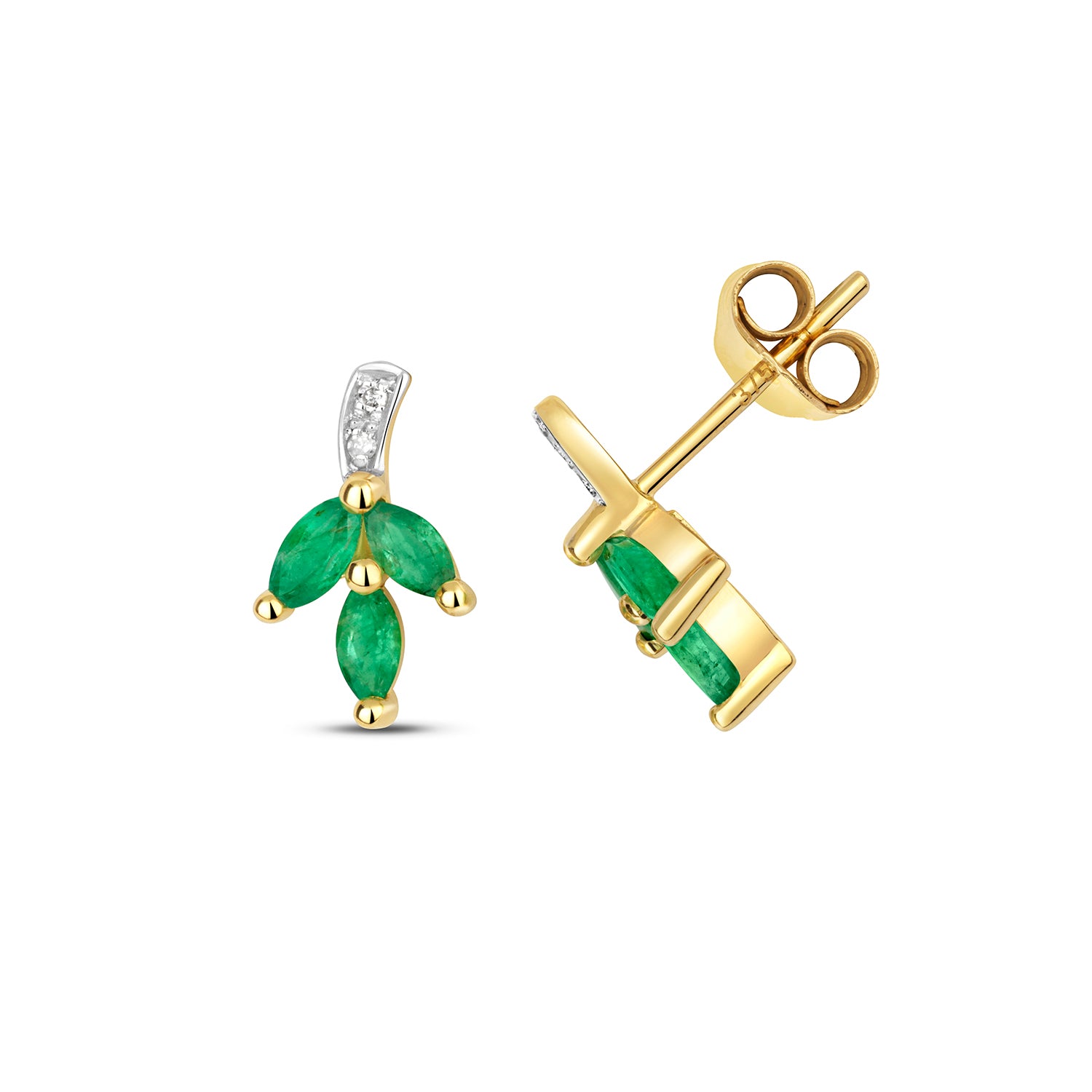 - 9ct Yellow Gold Emerald Diamond Leaf Design Earrings