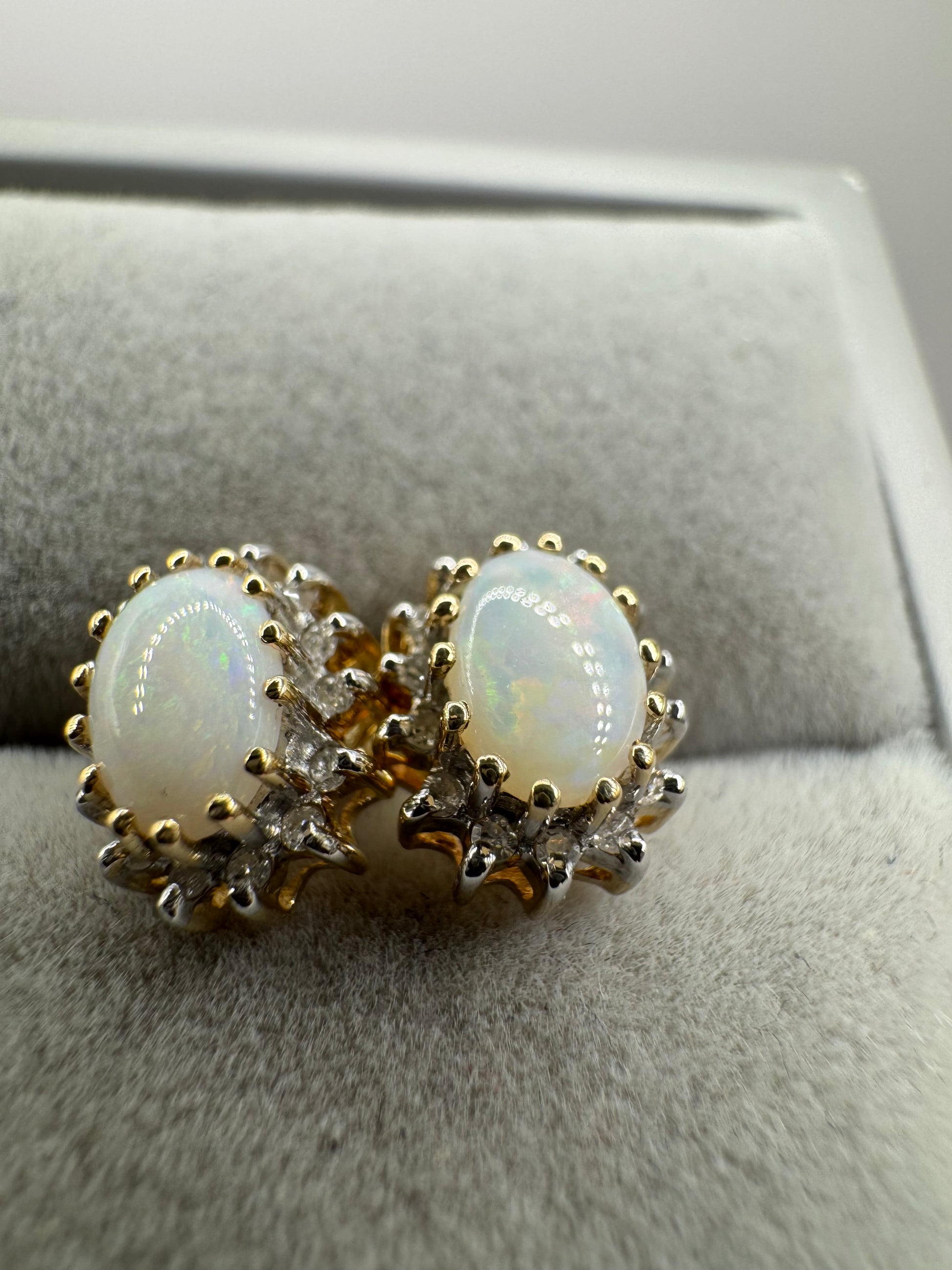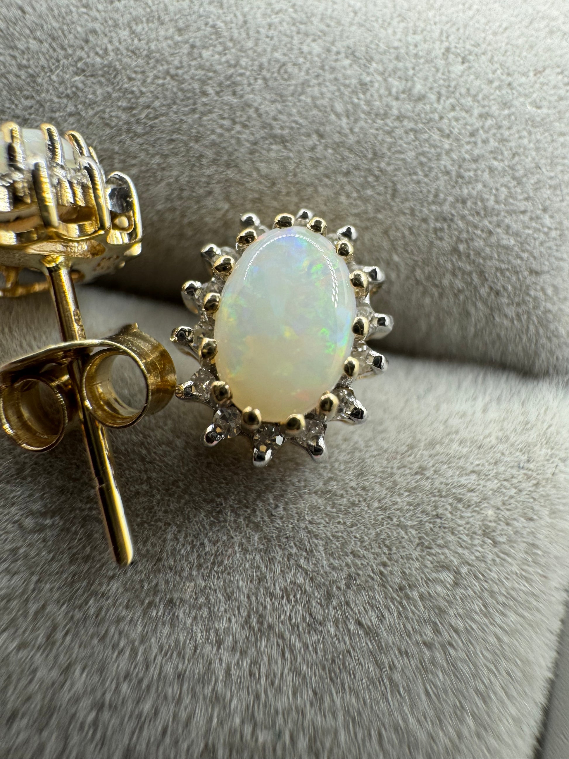 - 9ct Yellow Gold Halo Natural Opal and Diamond Stud Earrings