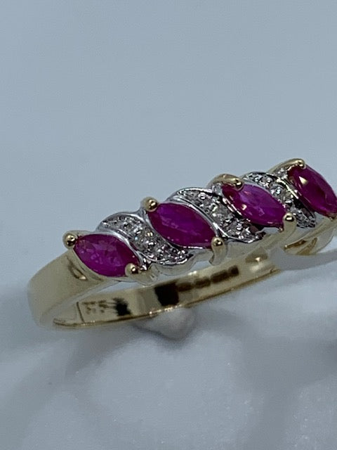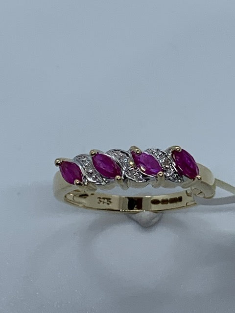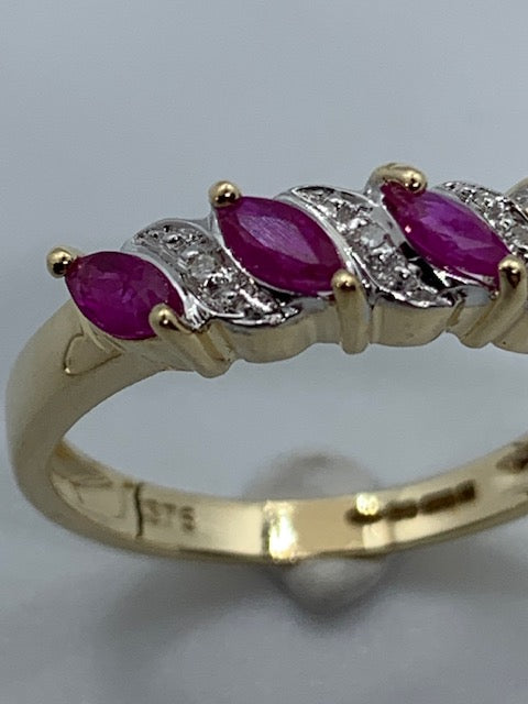 - 9ct Yellow Gold Marquise Ruby Gemstone and Diamond Ring