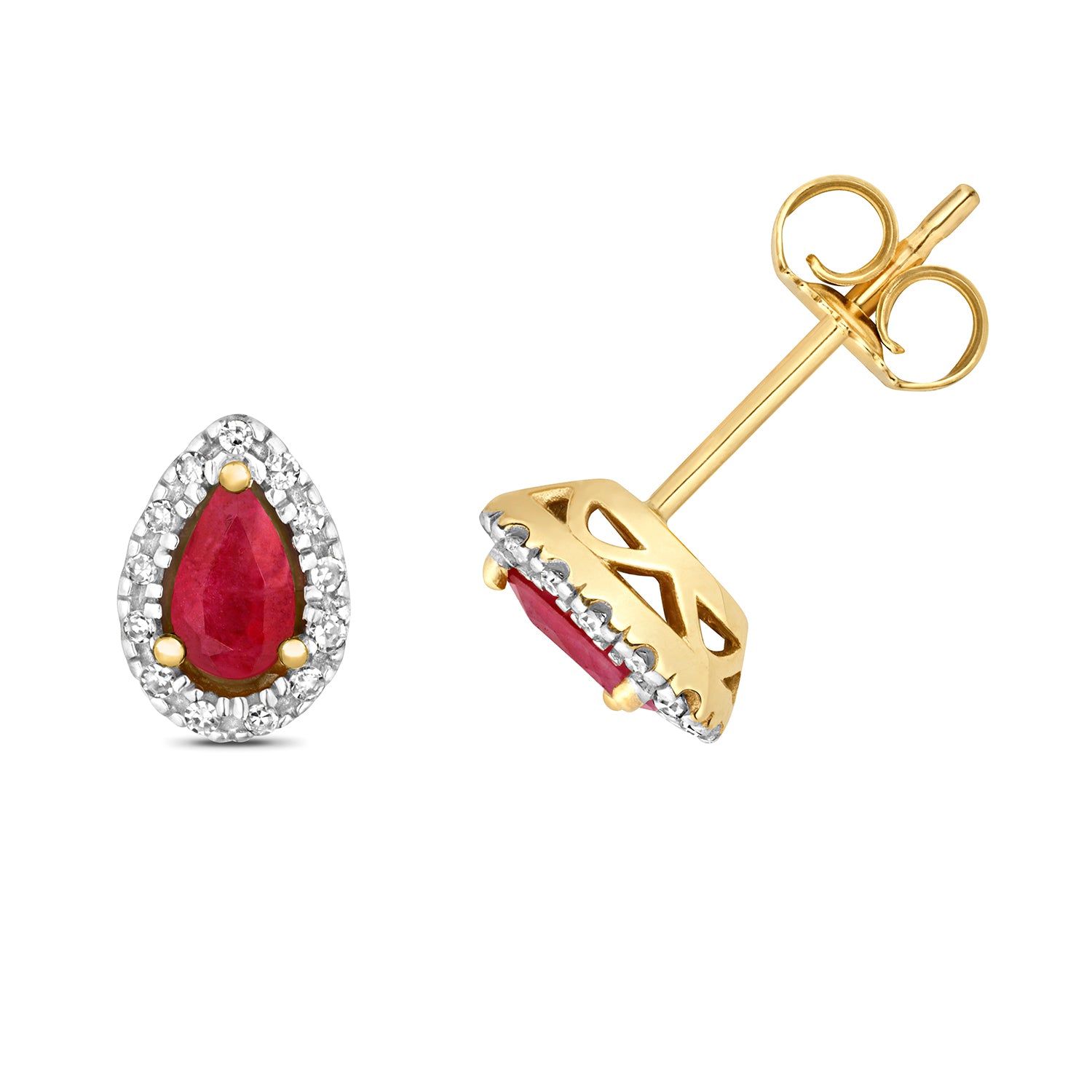 - 9ct Yellow Gold Natural Ruby Pearcut and Diamond Cluster Stud Earrings