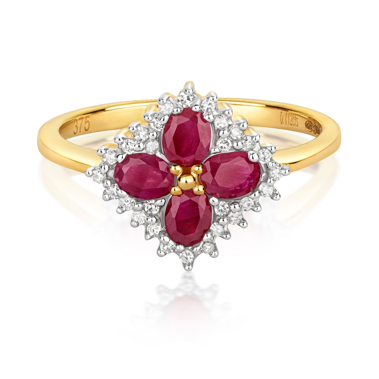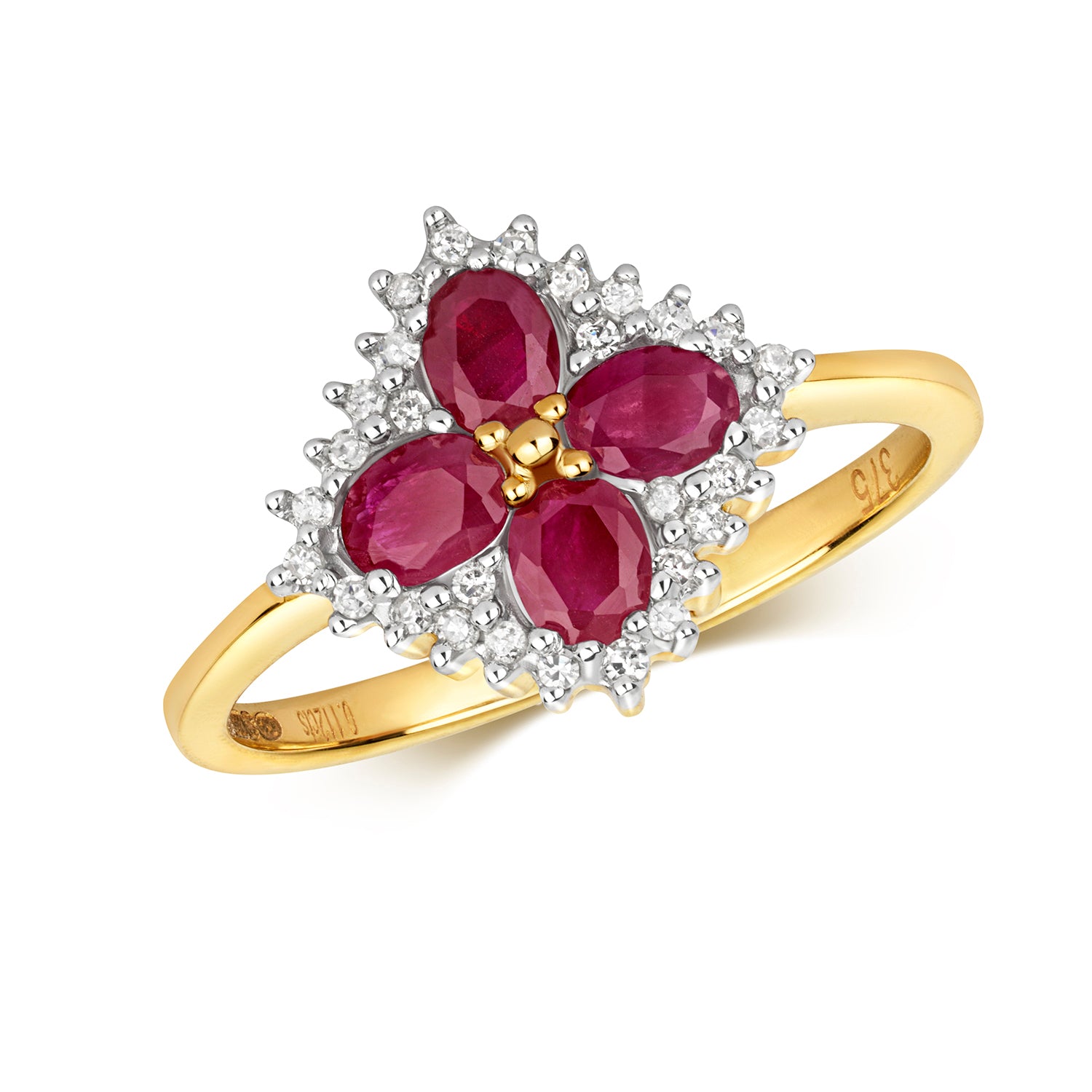 - 9ct Yellow Gold Ruby Gemstone and Diamond Clover Cluster Ring