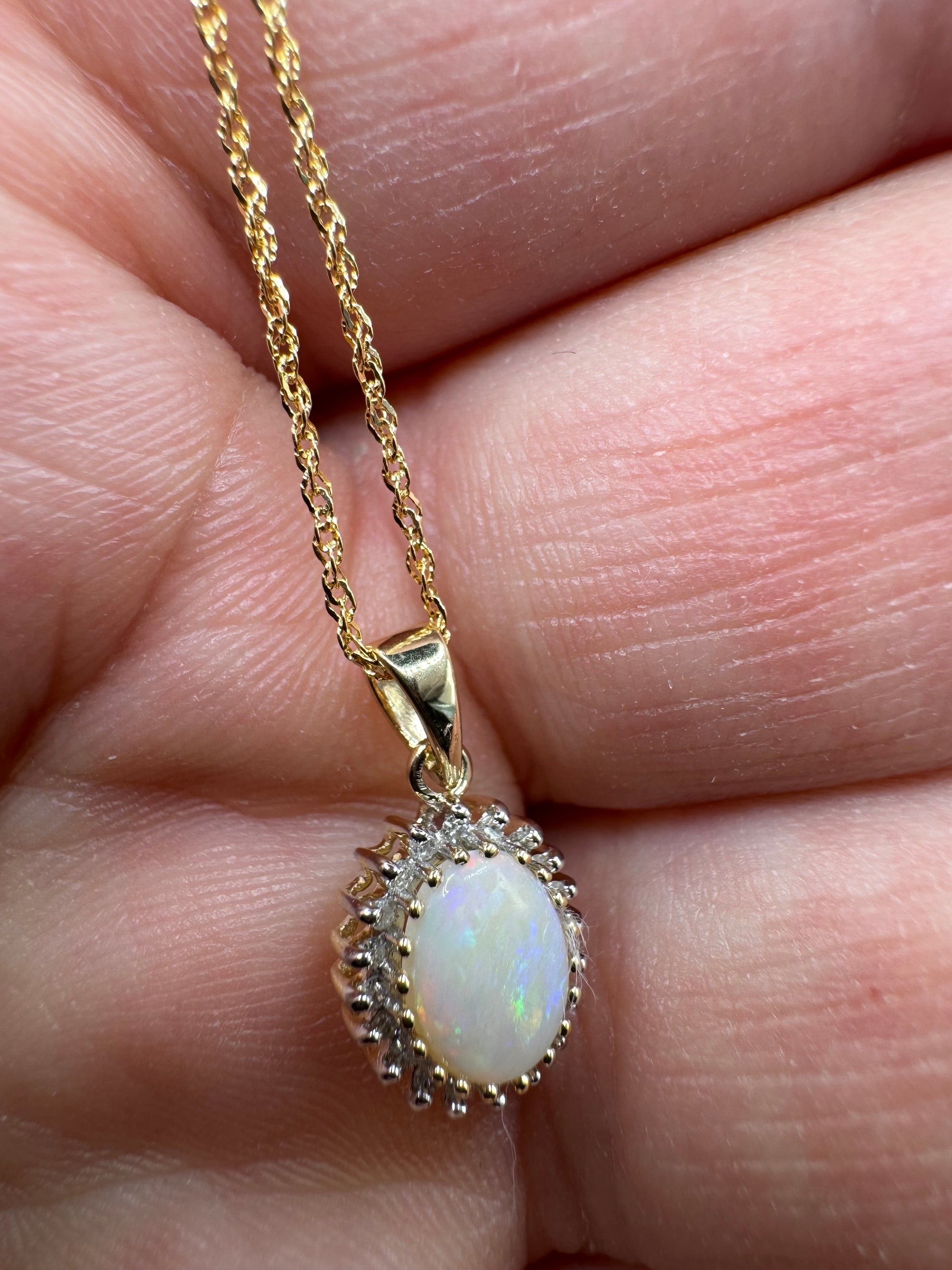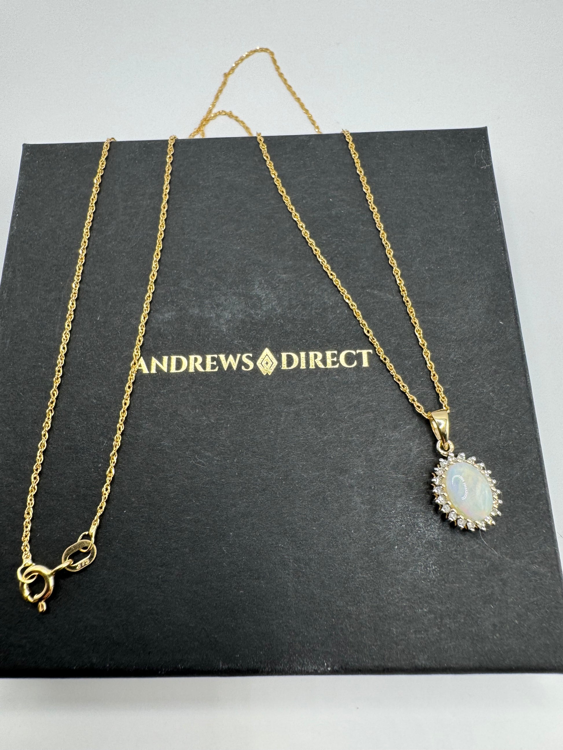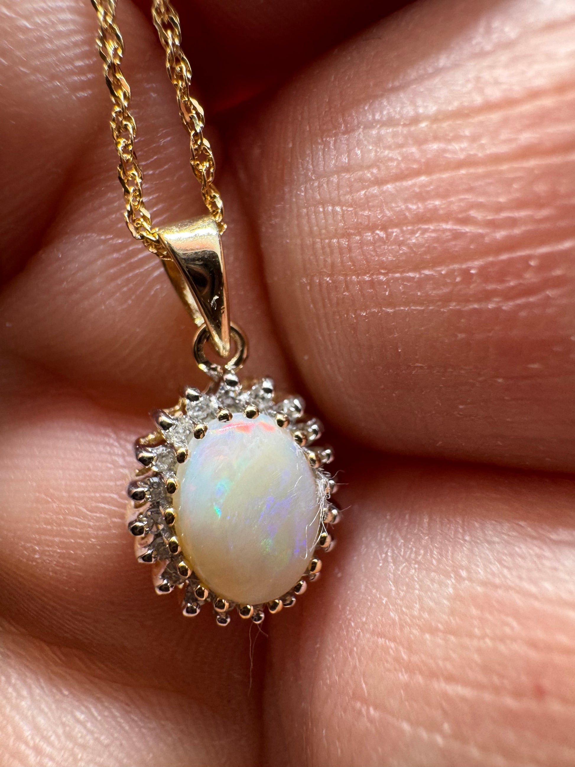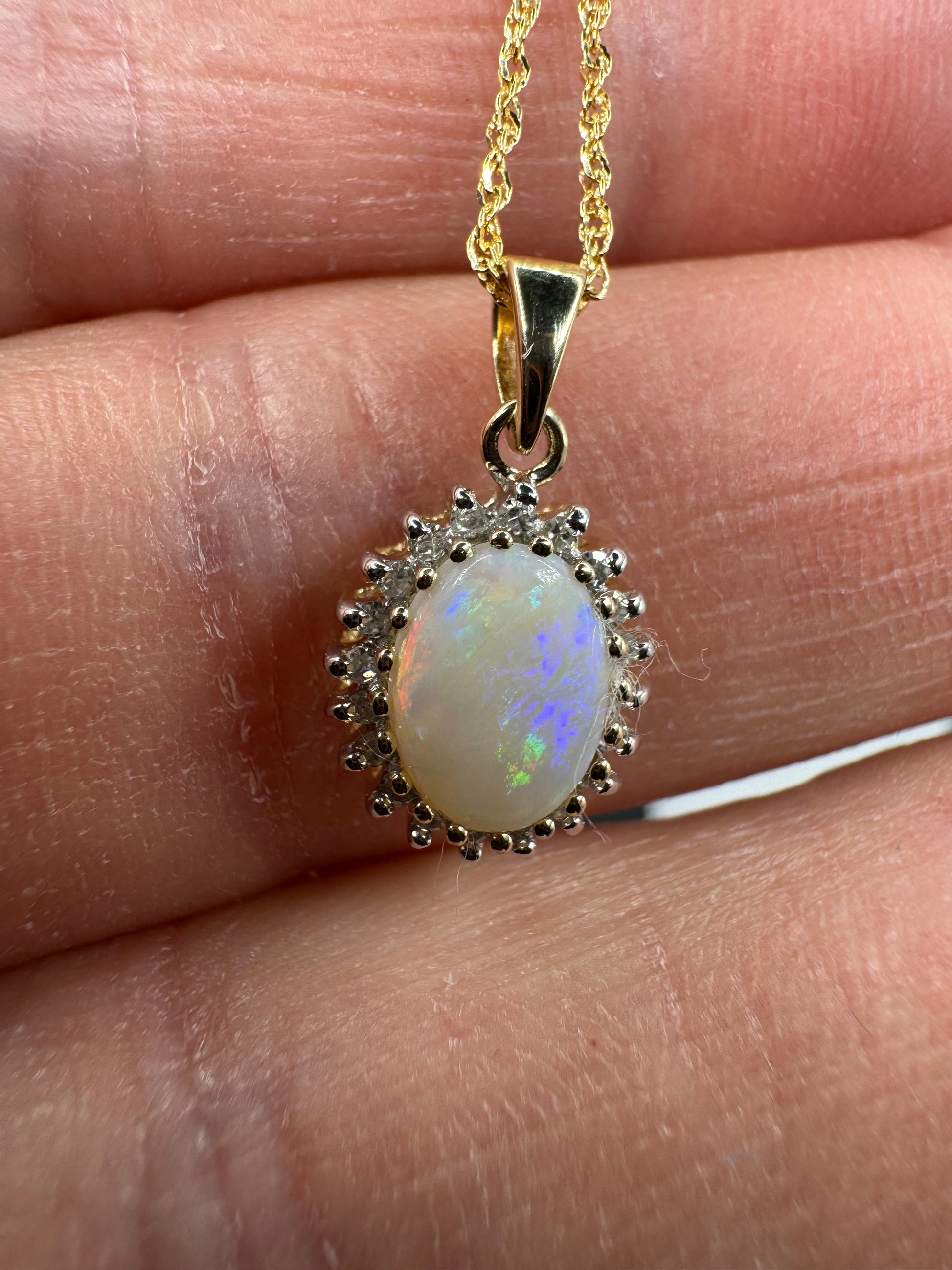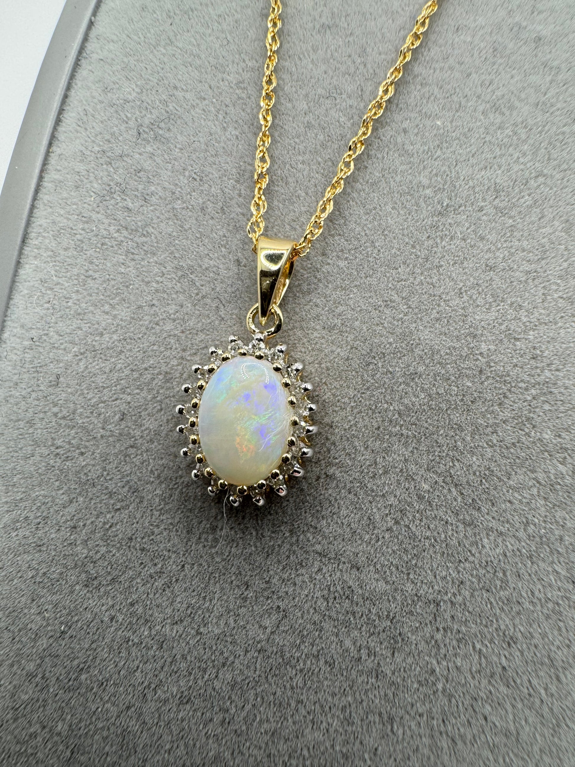 - 9ct Yellow Gold Real Opal Diamond Cluster Pendant Necklace