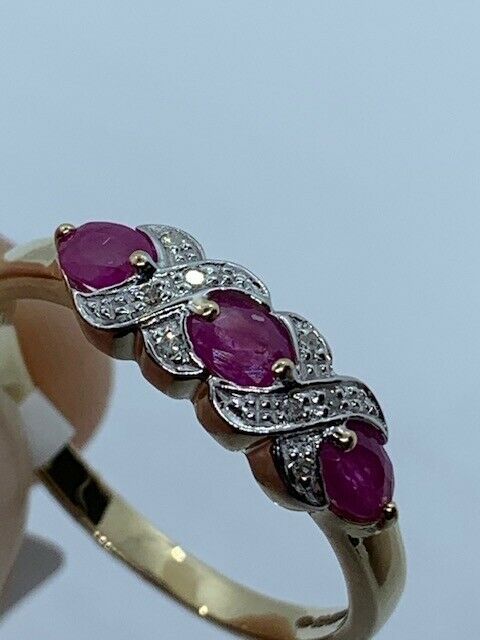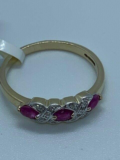 9ct Yellow Gold Triple Ruby Gemstone and Diamond Ring, Sizes J to Q (294)