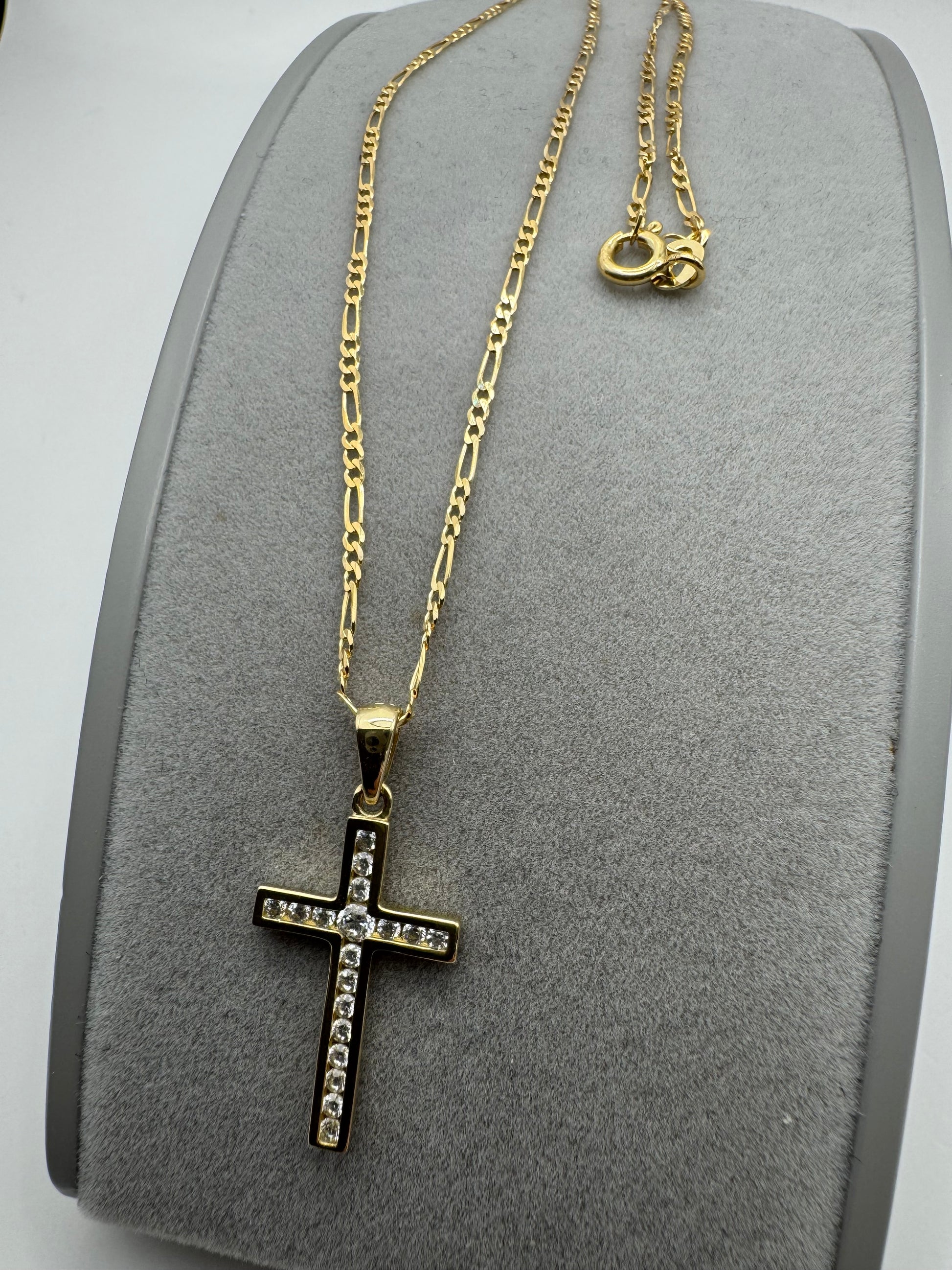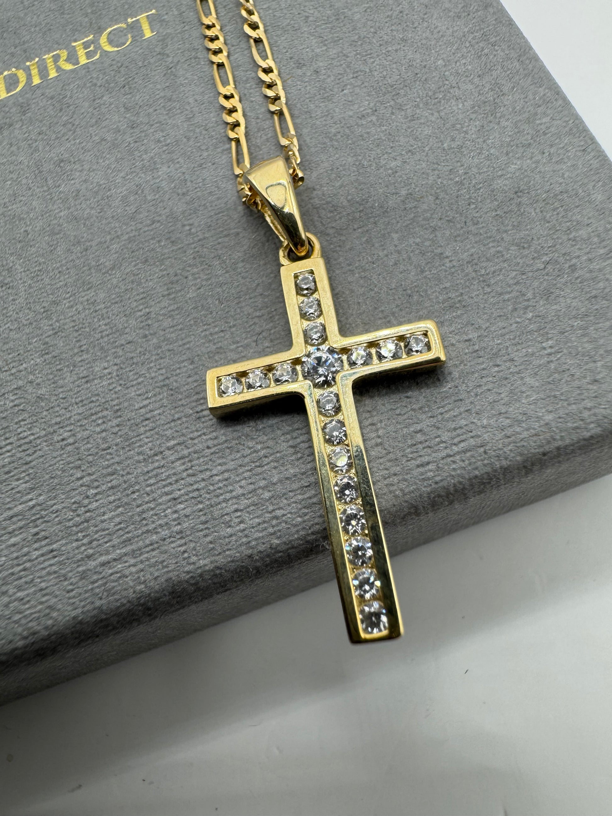 9ct Yellow Gold Zirconia Set Cross Pendant on 18" Figaro Chain (149.004A)